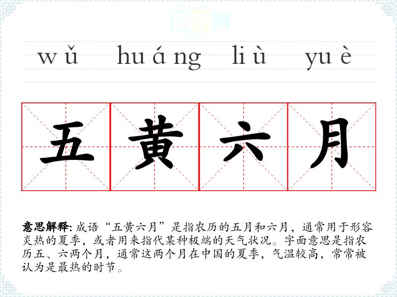 | 五黄六月 | 指阴历五、六月间天气最炎热的时候。 |