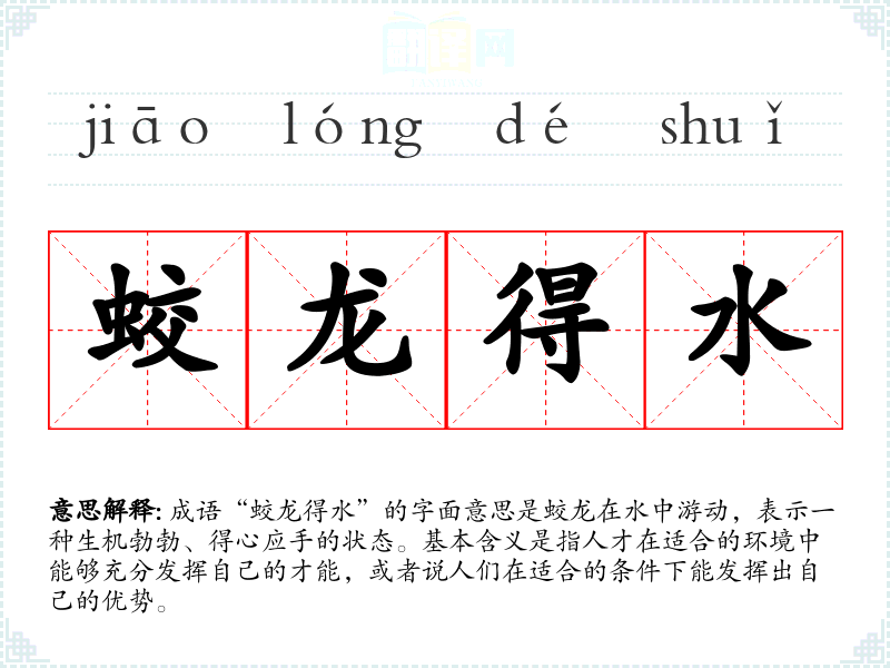 成语“蛟龙得水”的字面意思是蛟龙在水中游动,表示一种生机勃勃、得心应手的状态。基本含义是指人才在适合的环境中能够充分发挥自己的才能,或者说人们在适合的条件下能发挥出自己的优势。