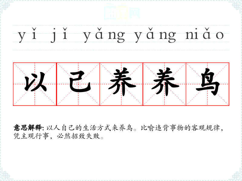 | 以己养养鸟 | 以人自己的生活方式来养鸟。比喻违背事物的客观规律,凭主观行事,必然招致失败。 |