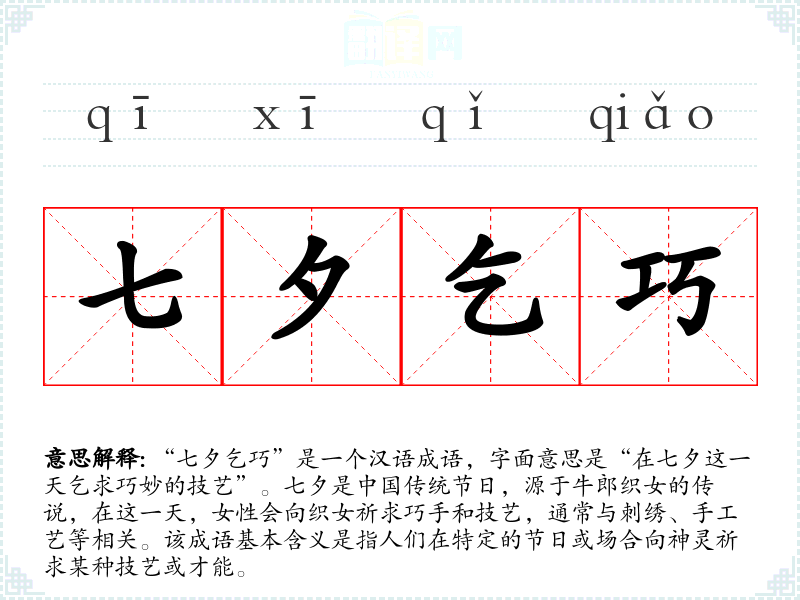 “七夕乞巧”是一个汉语成语,字面意思是“在七夕这一天乞求巧妙的技艺”。七夕是**传统节日,源于牛郎织女的传说,在这一天,女性会向织女祈求巧手和技艺,通常与刺绣、手工艺等相关。该成语基本含义是指人们在特定的节日或场合向神灵祈求某种技艺或才能。