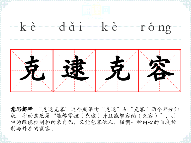 “克逮克容”并不是一个历史悠久的成语,更多是一种现代汉语的表达,可能受到传统文化中对自我修养与包容的重视影响。虽然具体出处不详,但可以联想到儒家思想中对自律和宽容的强调。