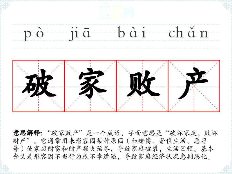 “破家败产”的成语来源并不明确,属于常见的汉语成语。它反映了古代社会对家庭和财富的重视,以及对不良行为(如奢侈消费、赌博等)的谴责。该成语的使用可以追溯到古代文人对家庭和财富的关注,虽然没有具体的历史典故,但在古代文学和民间故事中,类似的情节屡见不鲜。