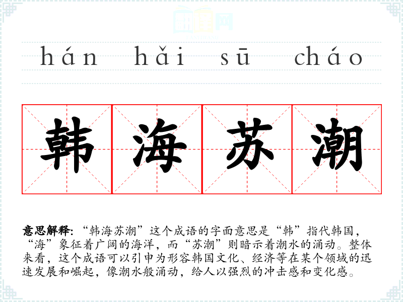 “韩海苏潮”这个成语的字面意思是“韩”指代韩国,“海”象征着广阔的海洋,而“苏潮”则暗示着潮水的涌动。整体来看,这个成语可以引申为形容韩国文化、经济等在某个领域的迅速发展和崛起,像潮水般涌动,给人以强烈的冲击感和变化感。