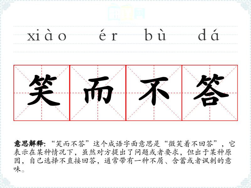 “笑而不答”这个成语字面意思是“微笑着不回答”,它表示在某种情况下,虽然对方提出了问题或者要求,但出于某种原因,自己选择不直接回答,通常带有一种不屑、含蓄或者讽刺的意味。