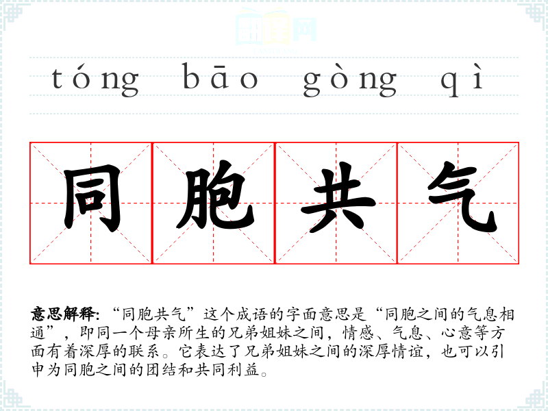 “同胞共气”这个成语的字面意思是“同胞之间的气息相通”,即同一个母亲所生的兄弟姐妹之间,情感、气息、心意等方面有着深厚的联系。它表达了兄弟姐妹之间的深厚情谊,也可以引申为同胞之间的团结和共同利益。