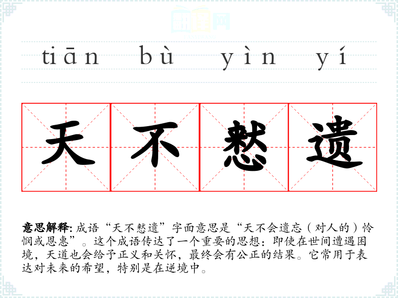 成语“天不慭遗”字面意思是“天不会遗忘(对人的)怜悯或恩惠”。这个成语传达了一个重要的思想:即使在世间遭遇困境,天道也会给予正义和关怀,最终会有公正的结果。它常用于表达对未来的希望,特别是在逆境中。