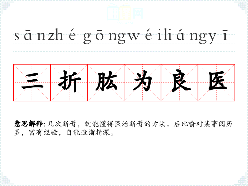 | 三折肱,为良医 | 几次断臂,就能知道医治断臂的方法。后比喻对某事阅历多,富有经验,成为内行。也指高明的医道。 |