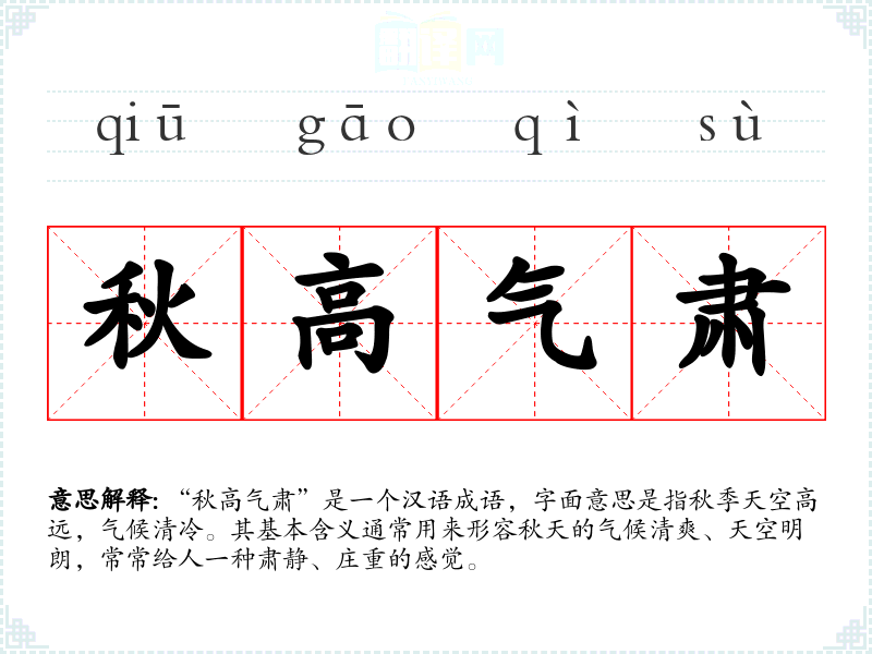 “秋高气肃”是一个汉语成语,字面意思是指秋季天空高远,气候清冷。其基本含义通常用来形容秋天的气候清爽、天空明朗,常常给人一种肃静、庄重的感觉。