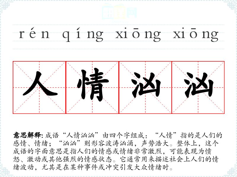 “人情汹汹”给人一种紧张和不安的情感反应,联想到社会冲突、群体抗议等情景。这种情绪的激烈性也引发了对社会公正和人际关系的思考,提醒我们关注人与人之间的情感联系。
