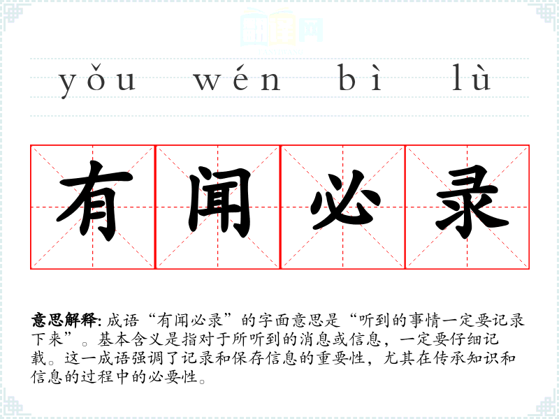 成语“有闻必录”的字面意思是“听到的事情一定要记录下来”。基本含义是指对于所听到的消息或信息,一定要仔细记载。这一成语强调了记录和保存信息的重要性,尤其在传承知识和信息的过程中的必要性。