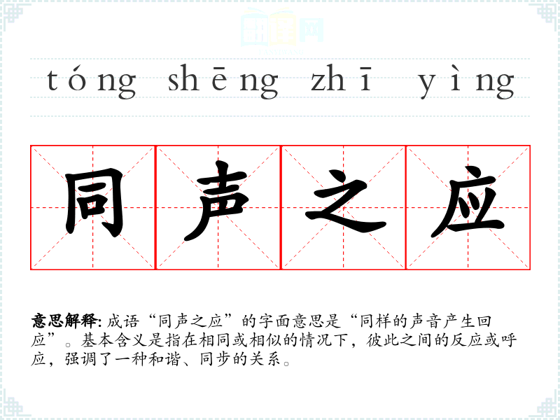 成语“同声之应”的字面意思是“同样的声音产生回应”。基本含义是指在相同或相似的情况下,彼此之间的反应或呼应,强调了一种和谐、同步的关系。