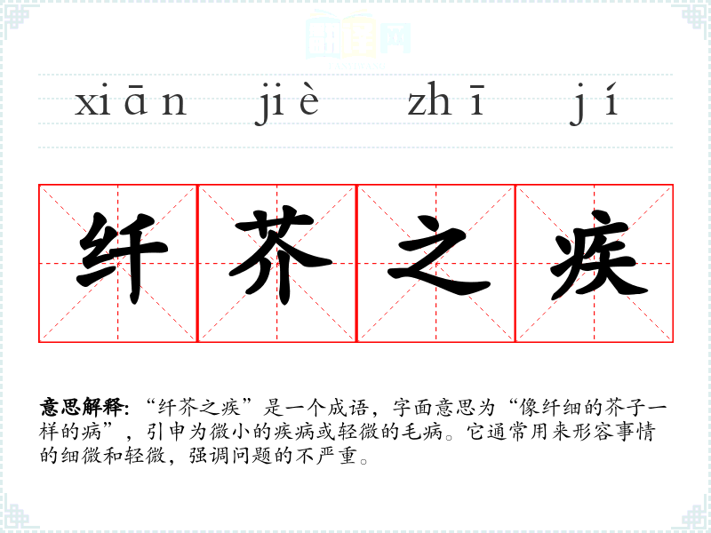 “纤芥之疾”是一个成语,字面意思为“像纤细的芥子一样的病”,引申为微小的疾病或轻微的毛病。它通常用来形容事情的细微和轻微,强调问题的不严重。