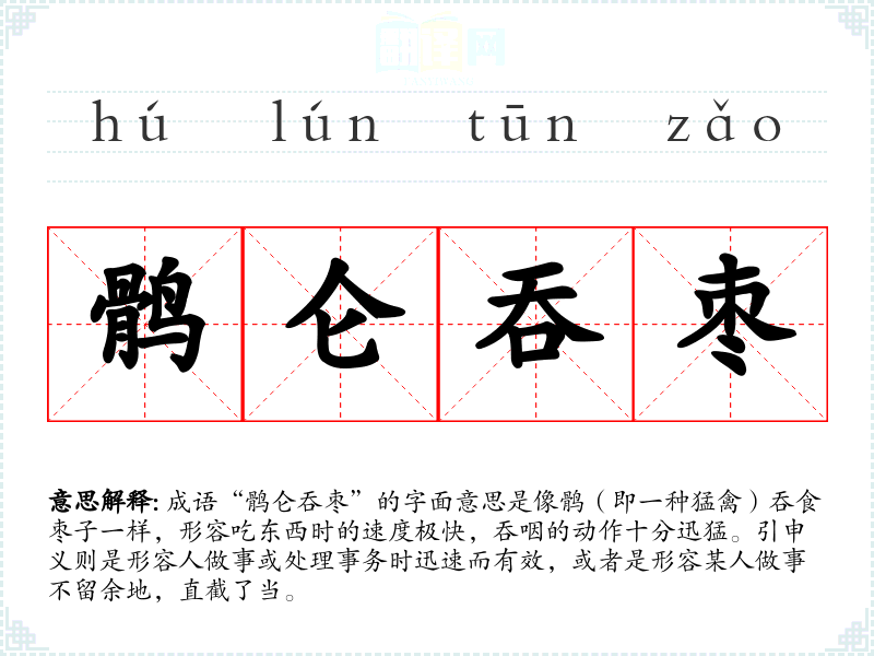 成语“鹘仑吞枣”的字面意思是像鹘(即一种猛禽)吞食枣子一样,形容吃东西时的速度极快,吞咽的动作十分迅猛。引申义则是形容人做事或处理事务时迅速而有效,或者是形容某人做事不留余地,直截了当。