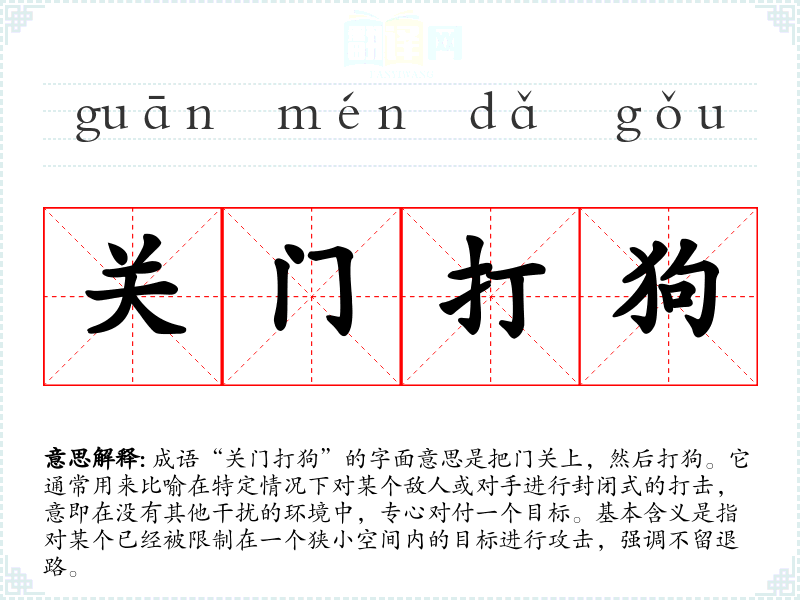 “关门打狗”这一成语源自古代的民间故事,常常被用来形容某些情况下对敌人或对手的针对性打击。最早出现在《红楼梦》中,书中提到的“关门打狗”用以形容一种制敌的方法,强调在特定环境中进行的针对性攻击。