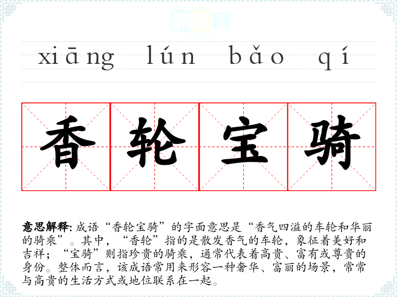 成语“香轮宝骑”的字面意思是“香气四溢的车轮和华丽的骑乘”。其中,“香轮”指的是散发香气的车轮,象征着美好和吉祥;“宝骑”则指珍贵的骑乘,通常代表着高贵、富有或尊贵的身份。整体而言,该成语常用来形容一种奢华、富丽的场景,常常与高贵的生活方式或地位联系在一起。