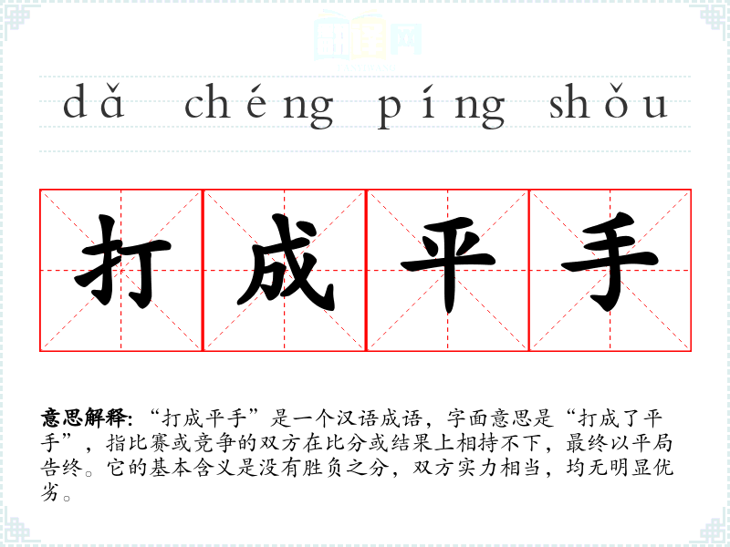 “打成平手”是一个汉语成语,字面意思是“打成了平手”,指比赛或竞争的双方在比分或结果上相持不下,最终以平局告终。它的基本含义是没有胜负之分,双方实力相当,均无明显优劣。