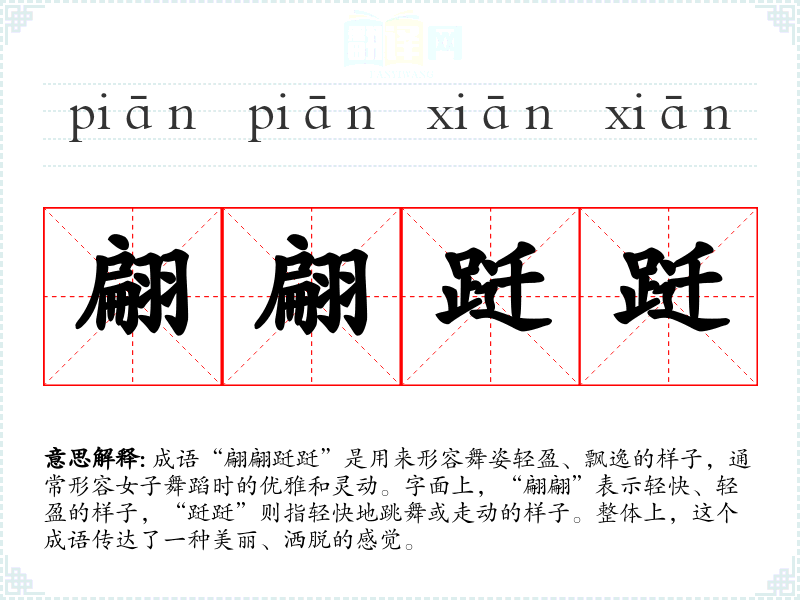 成语“翩翩跹跹”是用来形容舞姿轻盈、飘逸的样子,通常形容女子舞蹈时的优雅和灵动。字面上,“翩翩”表示轻快、轻盈的样子,“跹跹”则指轻快地跳舞或走动的样子。整体上,这个成语传达了一种美丽、洒脱的感觉。