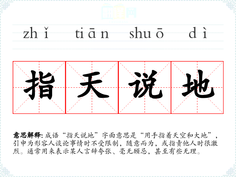 成语“指天说地”字面意思是“用手指着天空和大地”,引申为形容人谈论事情时不受限制,随意而为,或指责他人时很激烈。通常用来表示某人言辞夸张、毫无顾忌,甚至有些无理。