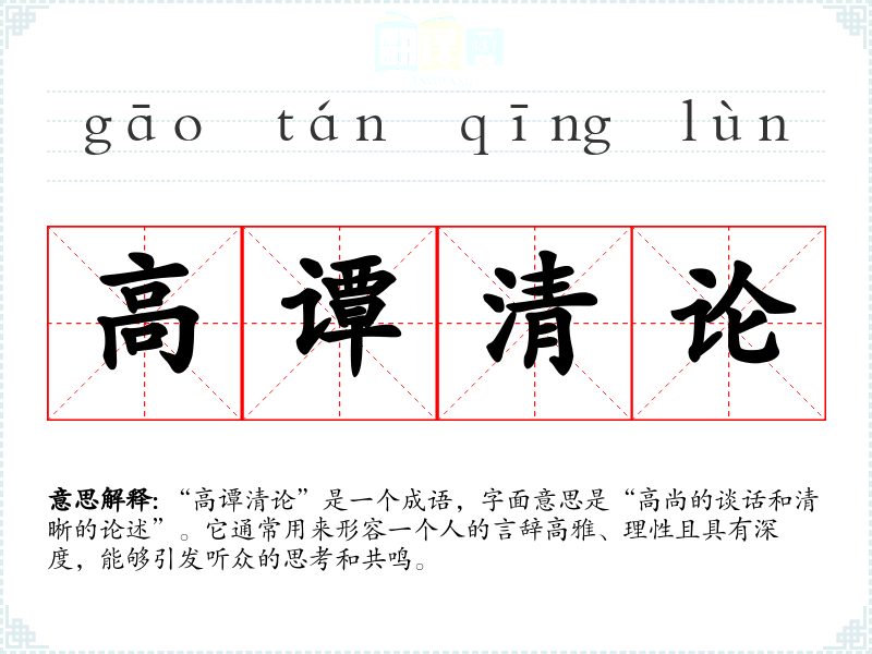 “高谭清论”是一个成语,字面意思是“高尚的谈话和清晰的论述”。它通常用来形容一个人的言辞高雅、理性且具有深度,能够引发听众的思考和共鸣。