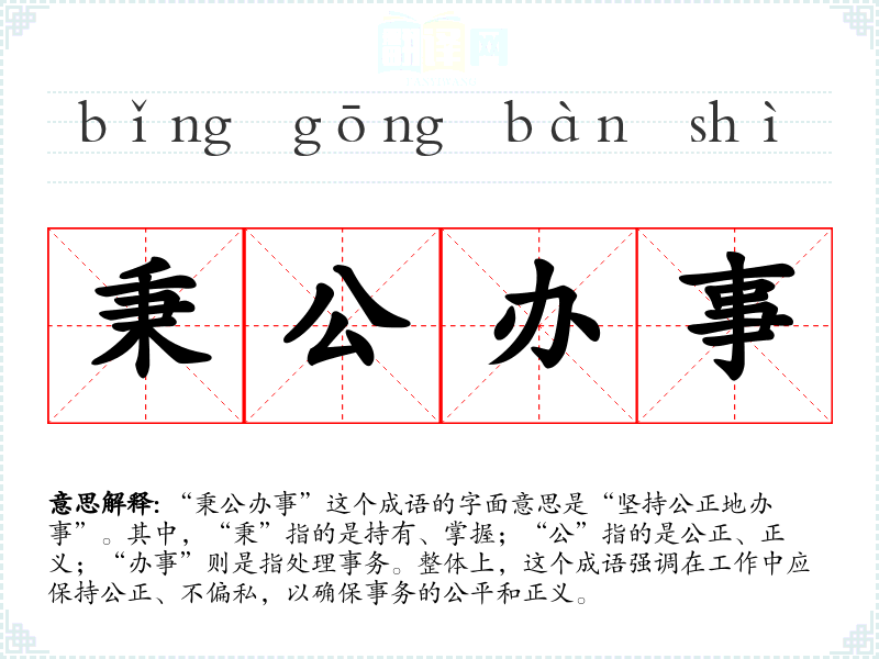 “秉公办事”这个成语的字面意思是“坚持公正地办事”。其中,“秉”指的是持有、掌握;“公”指的是公正、正义;“办事”则是指处理事务。整体上,这个成语强调在工作中应保持公正、不偏私,以确保事务的公平和正义。
