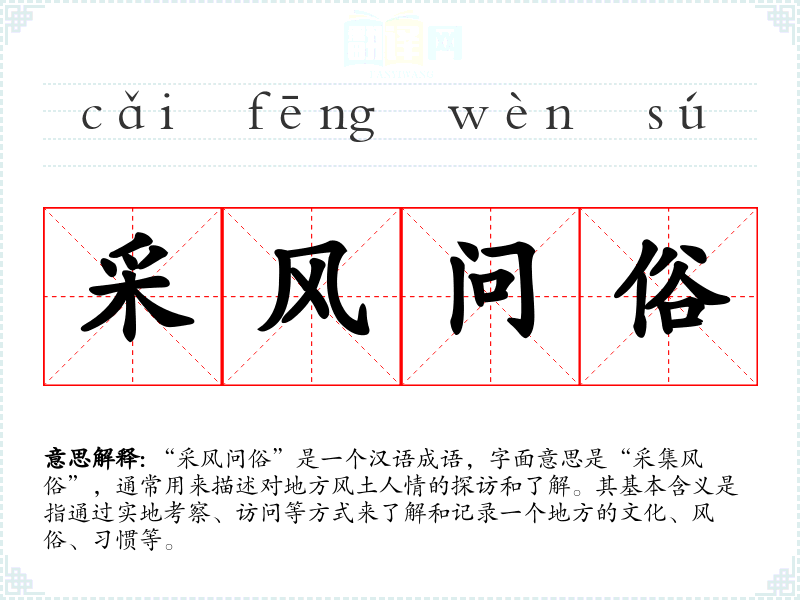 “采风问俗”是一个汉语成语,字面意思是“采集风俗”,通常用来描述对地方风土人情的探访和了解。其基本含义是指通过实地考察、访问等方式来了解和记录一个地方的文化、风俗、*惯等。