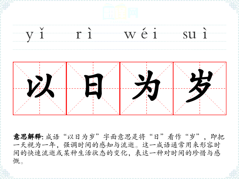 成语“以日为岁”字面意思是将“日”看作“岁”,即把一天视为一年,强调时间的感知与流逝。这一成语通常用来形容时间的快速流逝或某种生活状态的变化,表达一种对时间的珍惜与感慨。