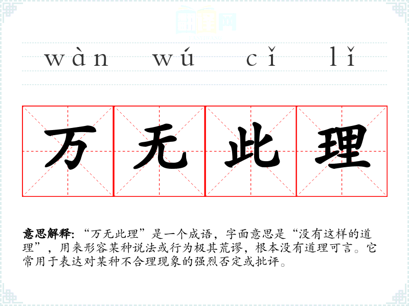 “万无此理”是一个成语,字面意思是“没有这样的道理”,用来形容某种说法或行为极其荒谬,根本没有道理可言。它常用于表达对某种不合理现象的强烈否定或批评。