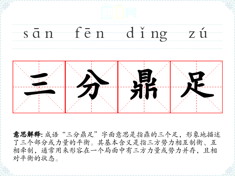 成语“三分鼎足”字面意思是指鼎的三个足,形象地描述了三个部分或力量的平衡。其基本含义是指三方势力相互制衡、互相牵制,通常用来形容在一个局面中有三方力量或势力并存,且相对平衡的状态。