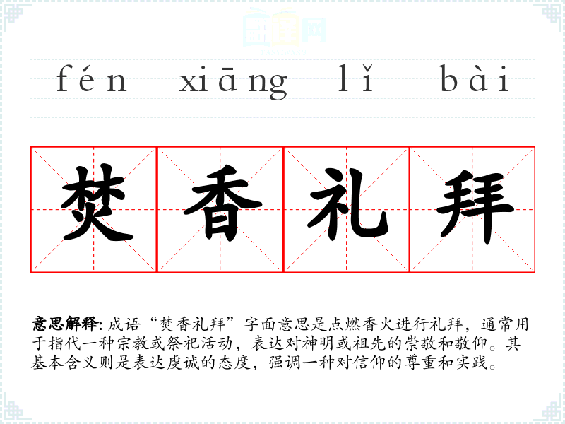 成语“焚香礼拜”字面意思是点燃香火进行礼拜,通常用于指代一种**或祭祀活动,表达对神明或祖先的崇敬和敬仰。其基本含义则是表达虔诚的态度,强调一种对信仰的尊重和实践。