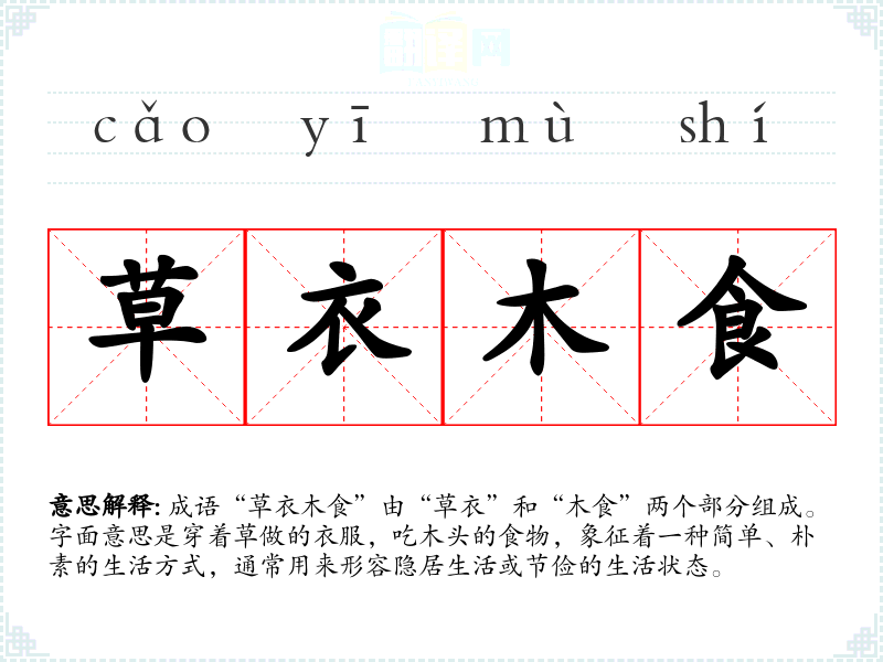 成语“草衣木食”由“草衣”和“木食”两个部分组成。字面意思是穿着草做的衣服,吃木头的食物,象征着一种简单、朴素的生活方式,通常用来形容隐居生活或节俭的生活状态。