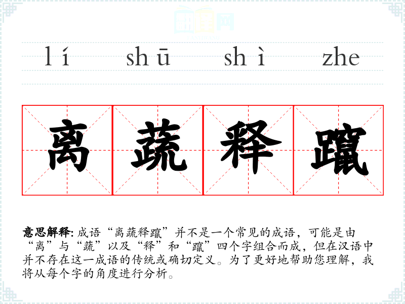 成语“离蔬释躥”并不是一个常见的成语,可能是由“离”与“蔬”以及“释”和“躥”四个字组合而成,但在汉语中并不存在这一成语的传统或确切定义。为了更好地帮助您理解,我将从每个字的角度进行分析。