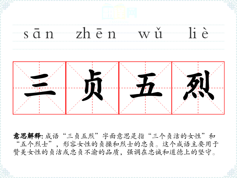 成语“三贞五烈”字面意思是指“三个贞洁的女性”和“五个烈士”,形容女性的贞操和烈士的忠贞。这个成语主要用于赞美女性的贞洁或忠贞不渝的品质,强调在忠诚和道德上的坚守。