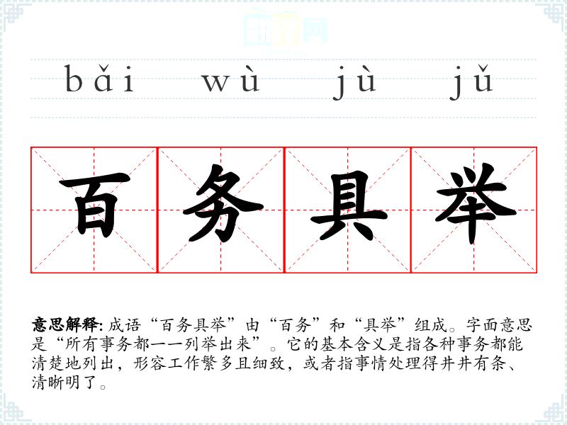 成语“百务具举”由“百务”和“具举”组成。字面意思是“所有事务都一一列举出来”。它的基本含义是指各种事务都能清楚地列出,形容工作繁多且细致,或者指事情处理得井井有条、清晰明了。