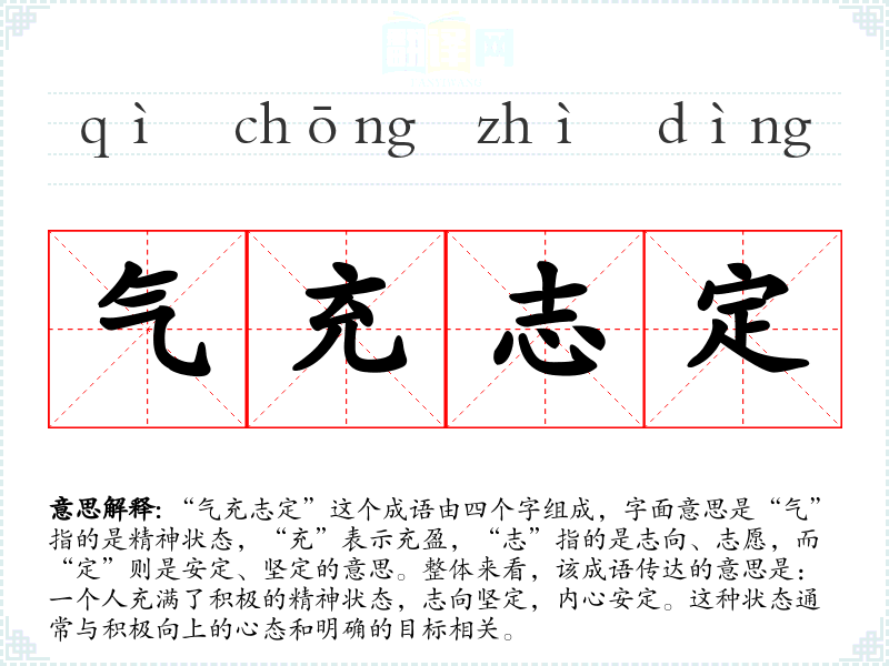 “气充志定”这个成语由四个字组成,字面意思是“气”指的是精神状态,“充”表示充盈,“志”指的是志向、志愿,而“定”则是安定、坚定的意思。整体来看,该成语传达的意思是:一个人充满了积极的精神状态,志向坚定,内心安定。这种状态通常与积极向上的心态和明确的目标相关。