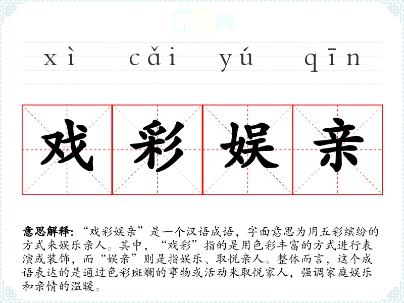 “戏彩娱亲”是一个汉语成语,字面意思为用五彩缤纷的方式来娱乐亲人。其中,“戏彩”指的是用色彩丰富的方式进行表演或装饰,而“娱亲”则是指娱乐、取悦亲人。整体而言,这个成语表达的是通过色彩斑斓的事物或活动来取悦家人,强调家庭娱乐和亲情的温暖。