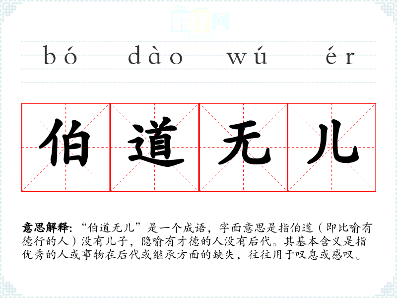 “伯道无儿”是一个成语,字面意思是指伯道(即比喻有德行的人)没有儿子,隐喻有才德的人没有后代。其基本含义是指优秀的人或事物在后代或继承方面的缺失,往往用于叹息或感叹。