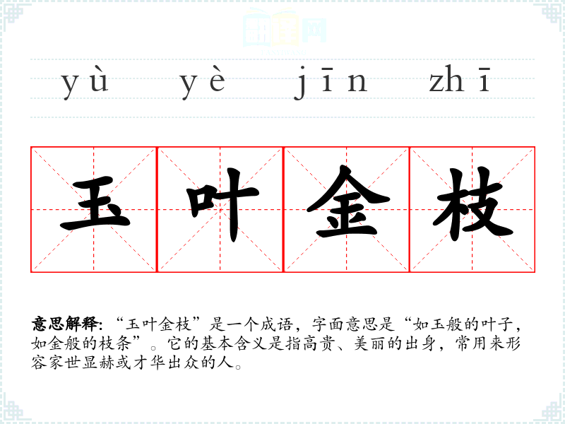 “玉叶金枝”是一个成语,字面意思是“如玉般的叶子,如金般的枝条”。它的基本含义是指高贵、美丽的出身,常用来形容家世显赫或才华出众的人。
