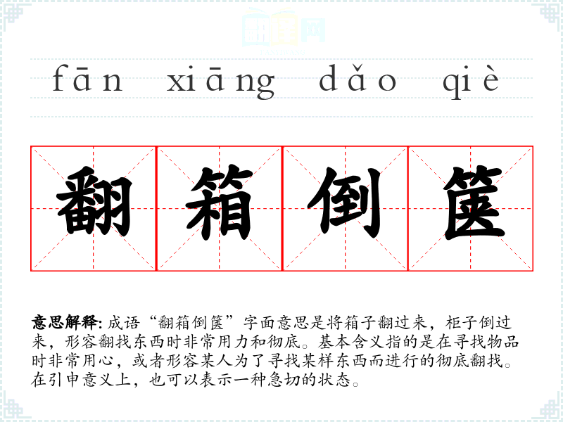 成语“翻箱倒箧”字面意思是将箱子翻过来,柜子倒过来,形容翻找东西时非常用力和彻底。基本含义指的是在寻找物品时非常用心,或者形容某人为了寻找某样东西而进行的彻底翻找。在引申意义上,也可以表示一种急切的状态。
