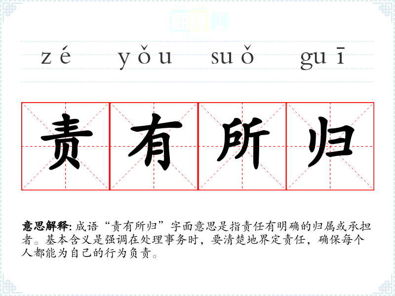 成语“责有所归”字面意思是指责任有明确的归属或承担者。基本含义是强调在处理事务时,要清楚地界定责任,确保每个人都能为自己的行为负责。