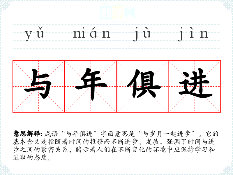 成语“与年俱进”字面意思是“与岁月一起进步”。它的基本含义是指随着时间的推移而不断进步、发展,强调了时间与进步之间的紧密关系,暗示着人们在不断变化的环境中应保持学*和进取的态度。