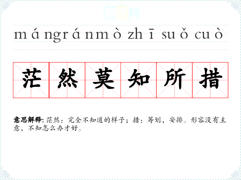 | 茫然不知所措 | 茫然:完全不知道的样子;措:筹划,安排。形容没有主意,不知怎么办才好。 |