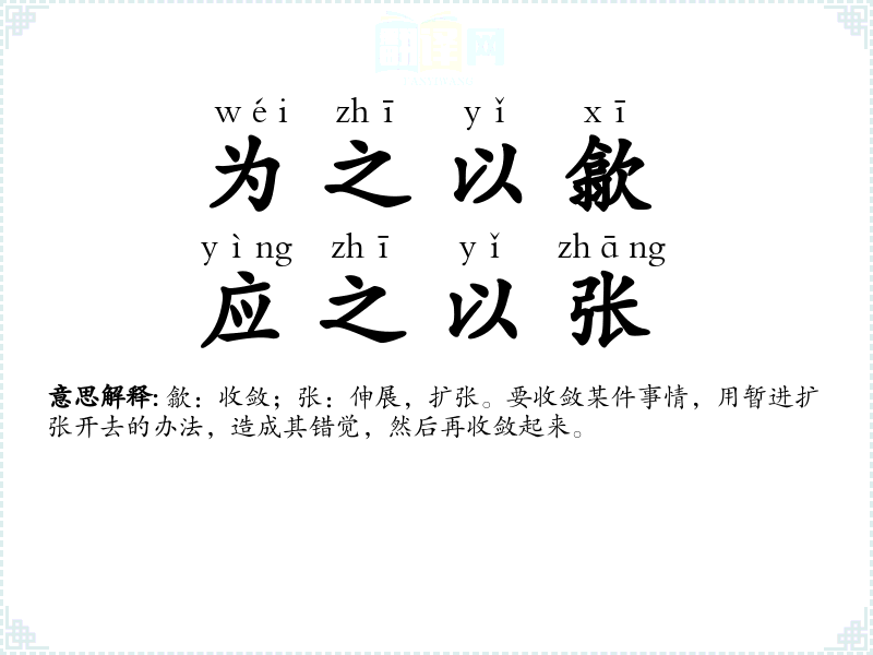歙:收敛;张:伸展,扩张。要收敛某件事情,用暂进扩张开去的办法,造成其错觉,然后再收敛起来。 |