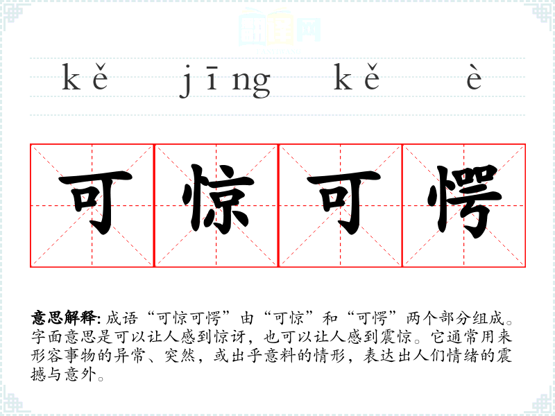 成语“可惊可愕”由“可惊”和“可愕”两个部分组成。字面意思是可以让人感到惊讶,也可以让人感到震惊。它通常用来形容事物的异常、突然,或出乎意料的情形,表达出人们情绪的震撼与意外。