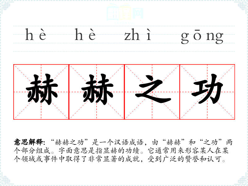 “赫赫”一词原意指光明、显著,常用来形容声名显赫、气势磅礴。而“之功”则指的是成就、功绩。“赫赫之功”最早可以追溯到古代文献,常常用来称赞历史上著名人物的伟大成就,如历史军事将领、政治家等。具体的出处不一,但在许多古籍中均有类似用法。