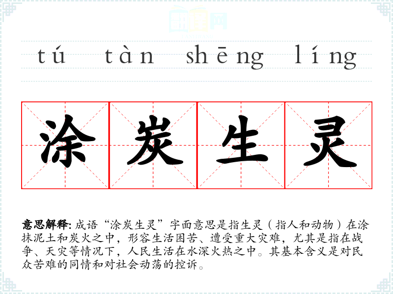 成语“涂炭生灵”字面意思是指生灵(指人和动物)在涂抹泥土和炭火之中,形容生活困苦、遭受重大灾难,尤其是指在战争、天灾等情况下,人民生活在水深火热之中。其基本含义是对民众苦难的同情和对社会动荡的控诉。