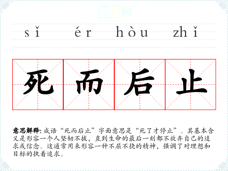 成语“死而后止”字面意思是“死了才停止”。其基本含义是形容一个人坚韧不拔,直到生命的最后一刻都不放弃自己的追求或信念。这通常用来形容一种不屈不挠的精神,强调了对理想和目标的执着追求。