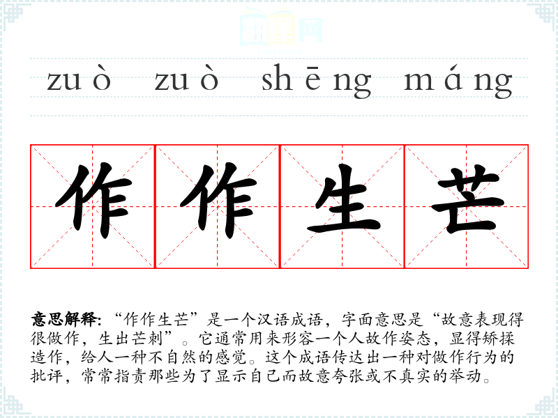 “作作生芒”并没有明确历史典故的出处,但其构成的词语在古代文学中有类似的表现。例如,“作作”常用于形容人的态度或行为做作,而“生芒”则可以理解为冒出来的刺,暗示着这种做作会让人感到不适。这个成语反映了中华文化中对于真实与做作之间的价值观念。