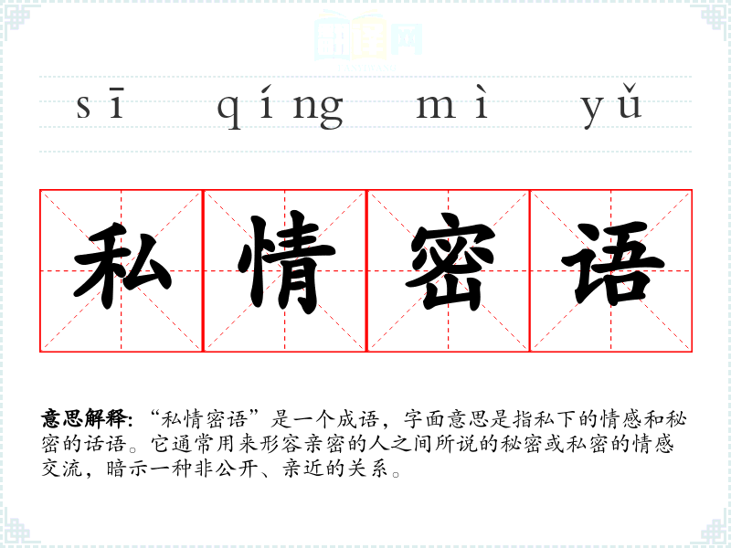 “私情密语”并没有特定的历史典故,但其构成的两个部分“私情”和“密语”在古代文学中常常出现,表示私密的情感和秘密的交流方式。在古代诗词中,常用来描绘恋人之间的私密交流。