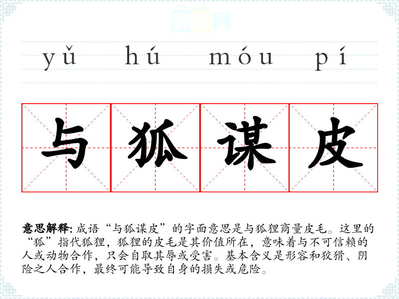成语“与狐谋皮”的字面意思是与狐狸商量皮毛。这里的“狐”指代狐狸,狐狸的皮毛是其价值所在,意味着与不可信赖的人或动物合作,只会自取其辱或受害。基本含义是形容和狡猾、阴险之人合作,最终可能导致自身的损失或危险。