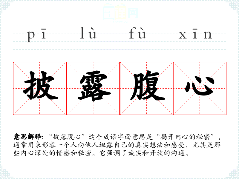 “披露腹心”这个成语字面意思是“揭开内心的秘密”,通常用来形容一个人向他人坦露自己的真实想法和感受,尤其是那些内心深处的情感和秘密。它强调了诚实和开放的沟通。